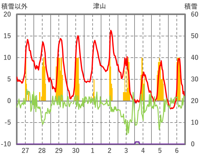 | 日 | 時 | 気温 | 降水 | 風向/風速 | 日照 | 積雪 | 降雪 |
