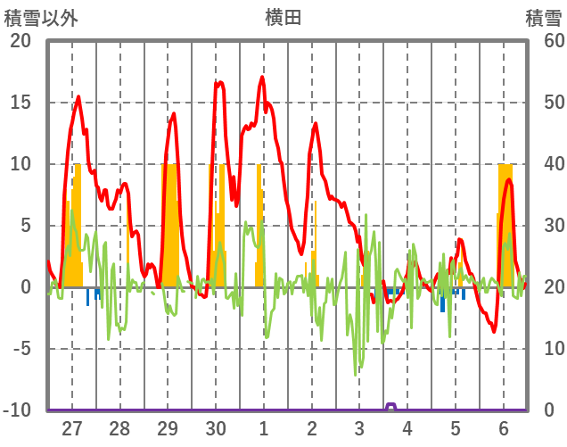 | 日 | 時 | 気温 | 降水 | 風向/風速 | 日照 | 積雪 | 降雪 |