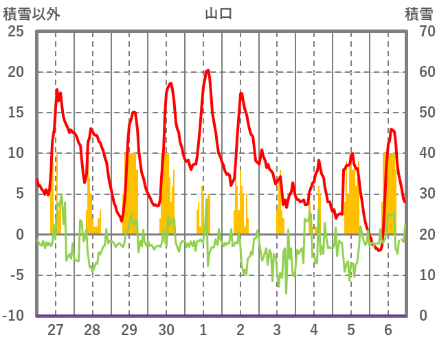 | 日 | 時 | 気温 | 降水 | 風向/風速 | 日照 | 積雪 | 降雪 |