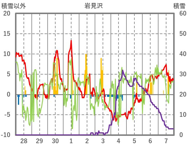 | 日 | 時 | 気温 | 降水 | 風向/風速 | 日照 | 積雪 | 降雪 |
