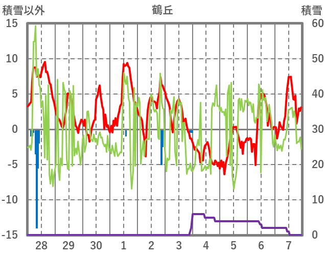 | 日 | 時 | 気温 | 降水 | 風向/風速 | 日照 | 積雪 | 降雪 |