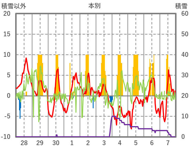 | 日 | 時 | 気温 | 降水 | 風向/風速 | 日照 | 積雪 | 降雪 |