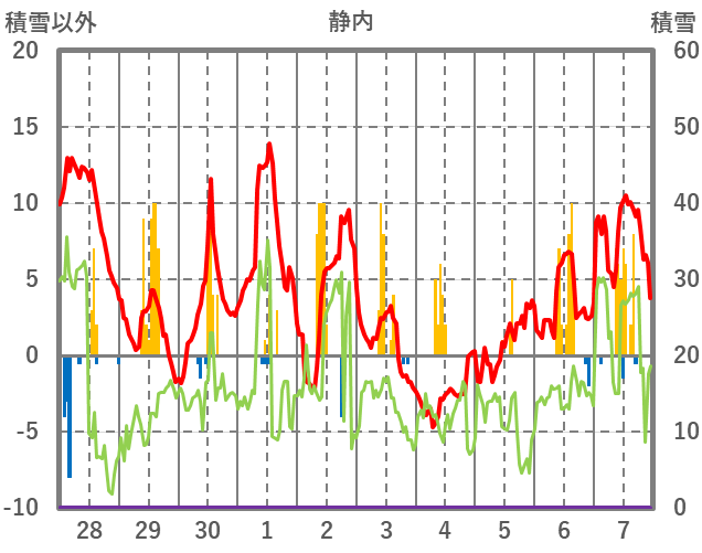 | 日 | 時 | 気温 | 降水 | 風向/風速 | 日照 | 積雪 | 降雪 |