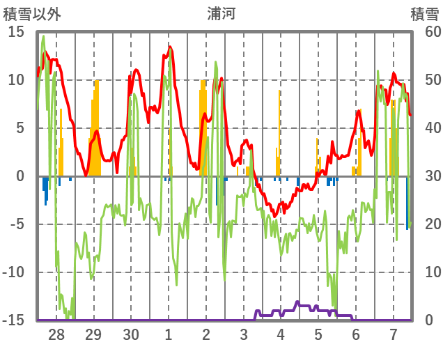 | 日 | 時 | 気温 | 降水 | 風向/風速 | 日照 | 積雪 | 降雪 |