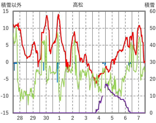| 日 | 時 | 気温 | 降水 | 風向/風速 | 日照 | 積雪 | 降雪 |