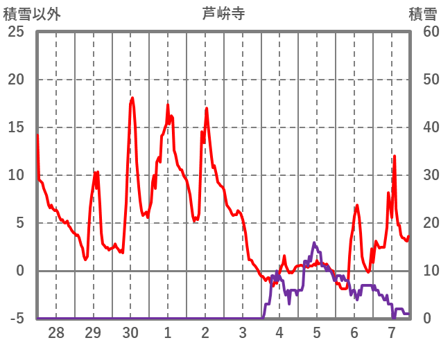 | 日 | 時 | 気温 | 降水 | 風向/風速 | 日照 | 積雪 | 降雪 |