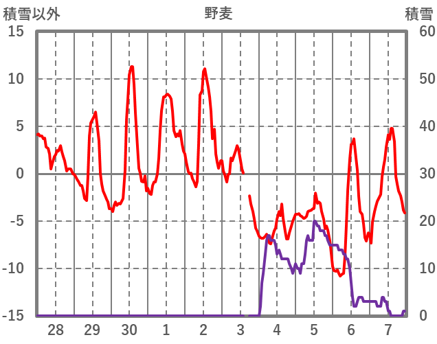 | 日 | 時 | 気温 | 降水 | 風向/風速 | 日照 | 積雪 | 降雪 |