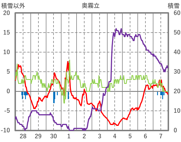 | 日 | 時 | 気温 | 降水 | 風向/風速 | 日照 | 積雪 | 降雪 |