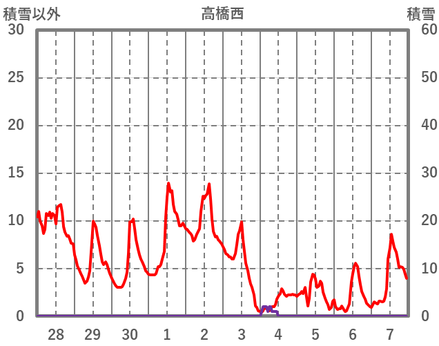 | 日 | 時 | 気温 | 降水 | 風向/風速 | 日照 | 積雪 | 降雪 |