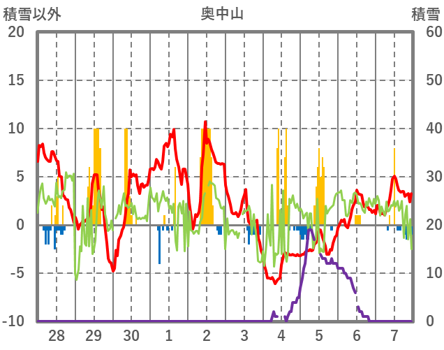 | 日 | 時 | 気温 | 降水 | 風向/風速 | 日照 | 積雪 | 降雪 |