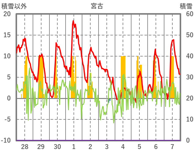 | 日 | 時 | 気温 | 降水 | 風向/風速 | 日照 | 積雪 | 降雪 |