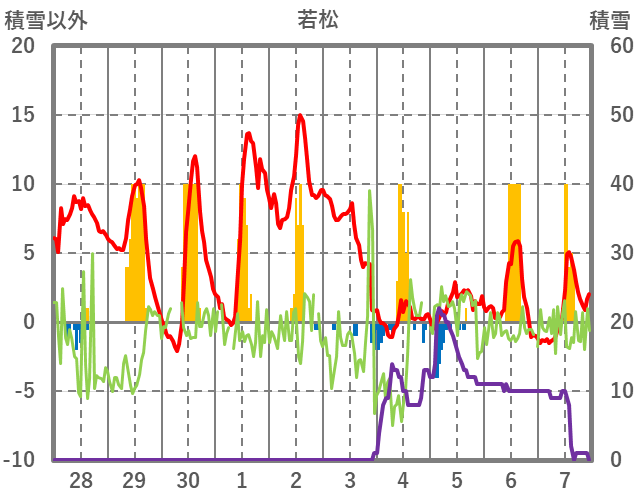 | 日 | 時 | 気温 | 降水 | 風向/風速 | 日照 | 積雪 | 降雪 |