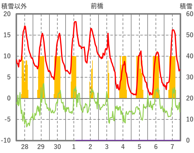 | 日 | 時 | 気温 | 降水 | 風向/風速 | 日照 | 積雪 | 降雪 |