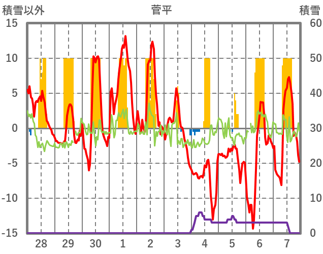 | 日 | 時 | 気温 | 降水 | 風向/風速 | 日照 | 積雪 | 降雪 |