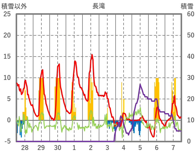 | 日 | 時 | 気温 | 降水 | 風向/風速 | 日照 | 積雪 | 降雪 |