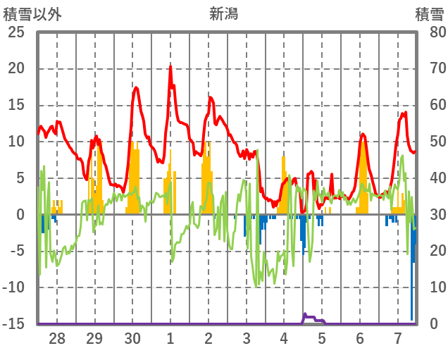 | 日 | 時 | 気温 | 降水 | 風向/風速 | 日照 | 積雪 | 降雪 |