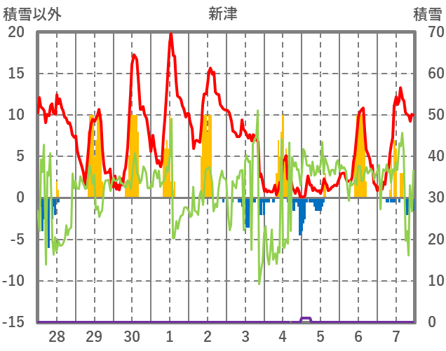 | 日 | 時 | 気温 | 降水 | 風向/風速 | 日照 | 積雪 | 降雪 |