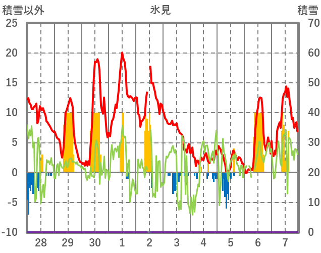 | 日 | 時 | 気温 | 降水 | 風向/風速 | 日照 | 積雪 | 降雪 |