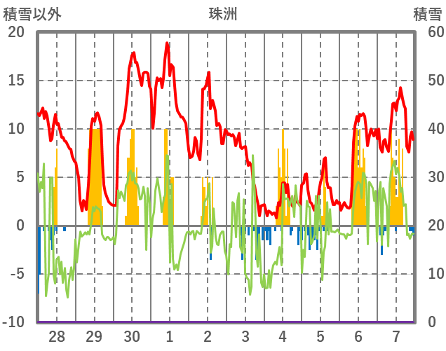 | 日 | 時 | 気温 | 降水 | 風向/風速 | 日照 | 積雪 | 降雪 |