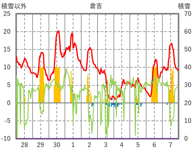 | 日 | 時 | 気温 | 降水 | 風向/風速 | 日照 | 積雪 | 降雪 |