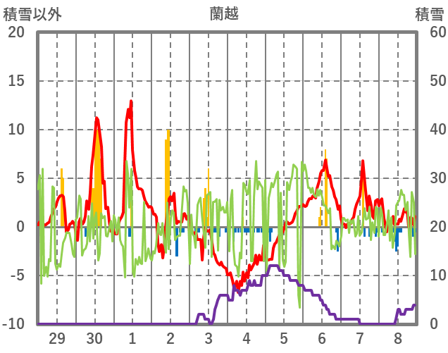 | 日 | 時 | 気温 | 降水 | 風向/風速 | 日照 | 積雪 | 降雪 |