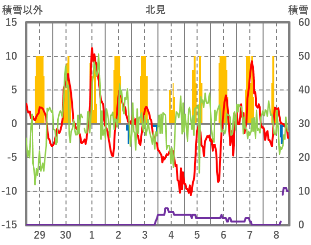 | 日 | 時 | 気温 | 降水 | 風向/風速 | 日照 | 積雪 | 降雪 |