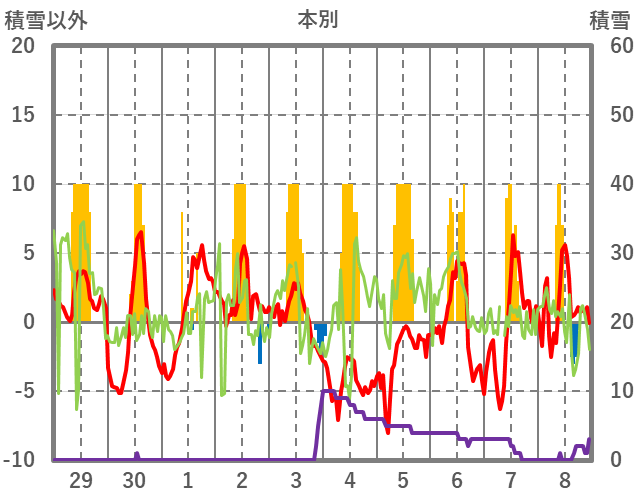 | 日 | 時 | 気温 | 降水 | 風向/風速 | 日照 | 積雪 | 降雪 |