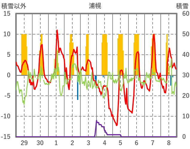 | 日 | 時 | 気温 | 降水 | 風向/風速 | 日照 | 積雪 | 降雪 |