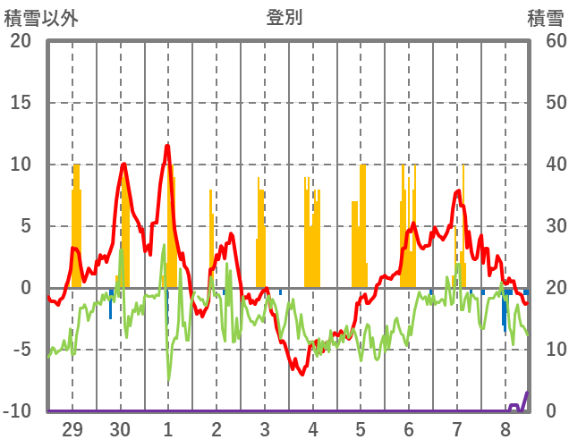 | 日 | 時 | 気温 | 降水 | 風向/風速 | 日照 | 積雪 | 降雪 |