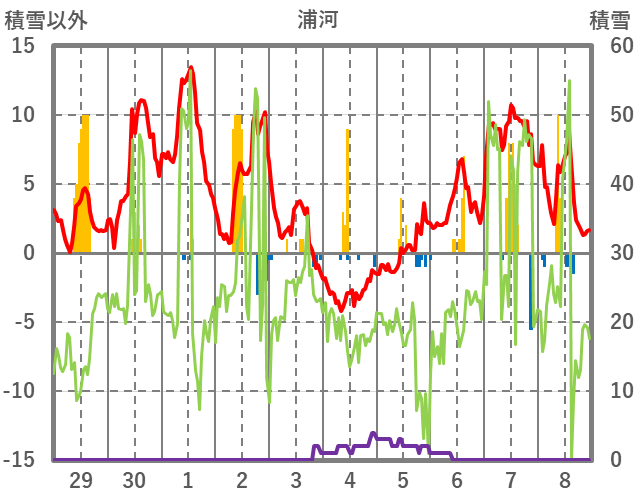 | 日 | 時 | 気温 | 降水 | 風向/風速 | 日照 | 積雪 | 降雪 |