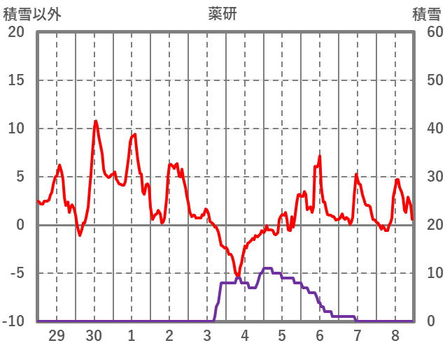| 日 | 時 | 気温 | 降水 | 風向/風速 | 日照 | 積雪 | 降雪 |