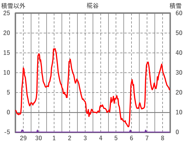 | 日 | 時 | 気温 | 降水 | 風向/風速 | 日照 | 積雪 | 降雪 |