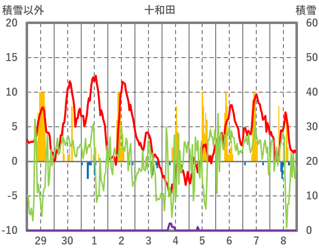 | 日 | 時 | 気温 | 降水 | 風向/風速 | 日照 | 積雪 | 降雪 |