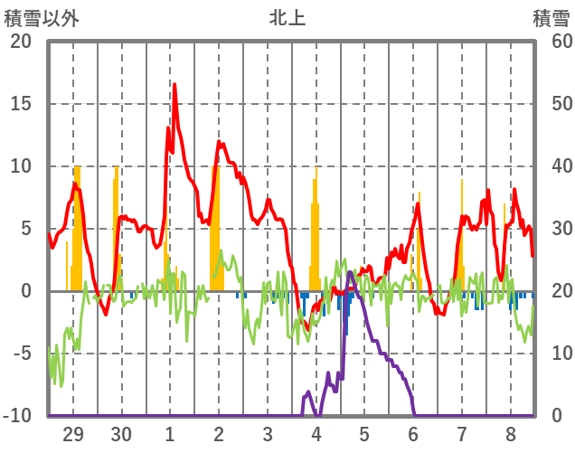| 日 | 時 | 気温 | 降水 | 風向/風速 | 日照 | 積雪 | 降雪 |