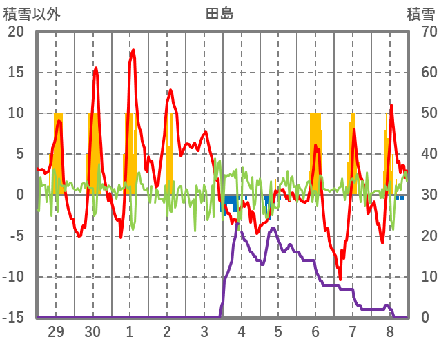 | 日 | 時 | 気温 | 降水 | 風向/風速 | 日照 | 積雪 | 降雪 |