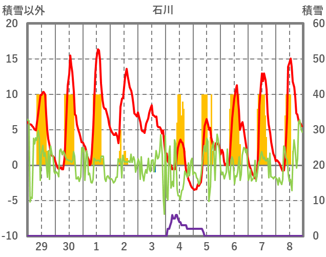 | 日 | 時 | 気温 | 降水 | 風向/風速 | 日照 | 積雪 | 降雪 |