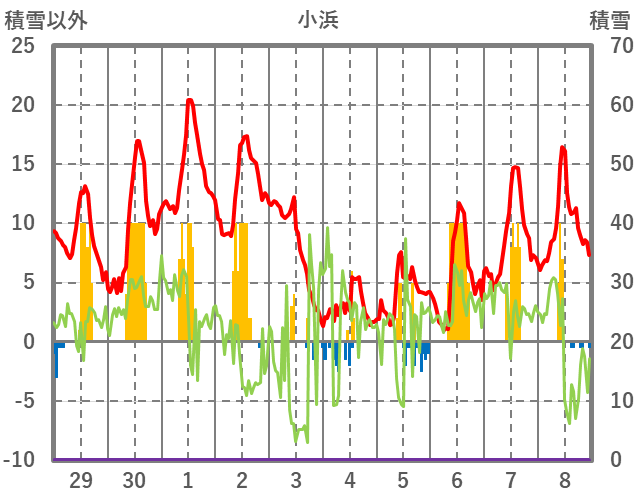 | 日 | 時 | 気温 | 降水 | 風向/風速 | 日照 | 積雪 | 降雪 |