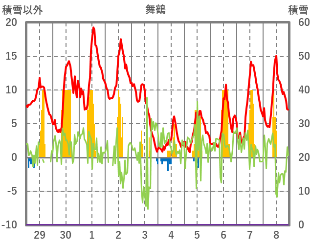 | 日 | 時 | 気温 | 降水 | 風向/風速 | 日照 | 積雪 | 降雪 |