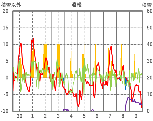 | 日 | 時 | 気温 | 降水 | 風向/風速 | 日照 | 積雪 | 降雪 |