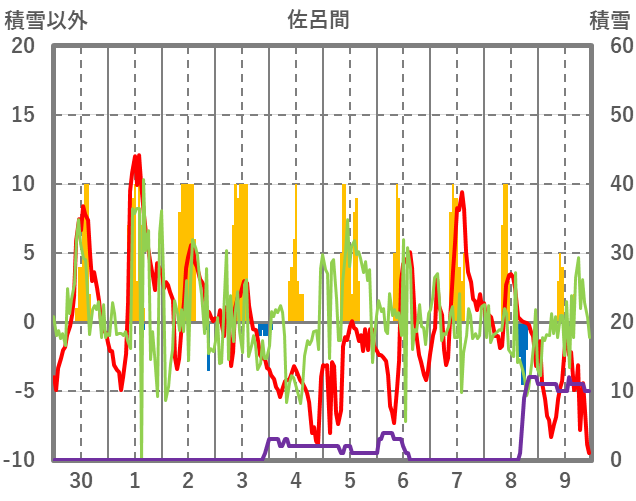 | 日 | 時 | 気温 | 降水 | 風向/風速 | 日照 | 積雪 | 降雪 |