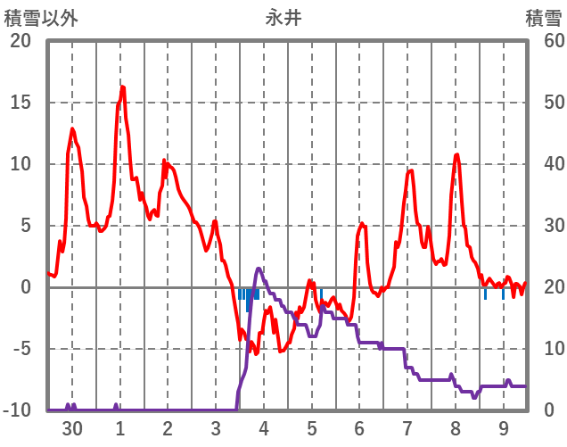 | 日 | 時 | 気温 | 降水 | 風向/風速 | 日照 | 積雪 | 降雪 |