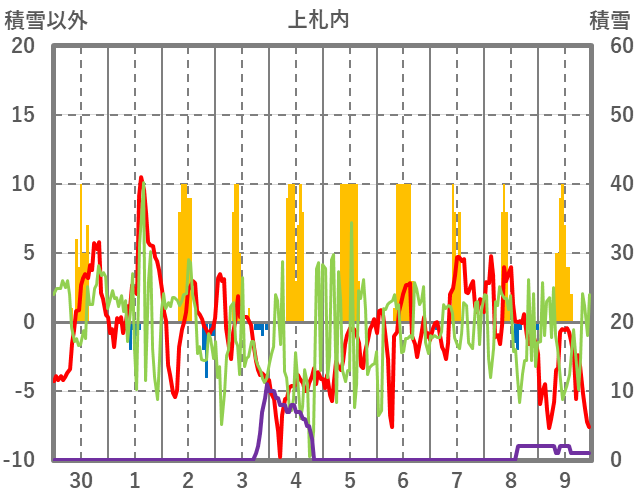| 日 | 時 | 気温 | 降水 | 風向/風速 | 日照 | 積雪 | 降雪 |