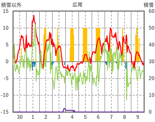 | 日 | 時 | 気温 | 降水 | 風向/風速 | 日照 | 積雪 | 降雪 |