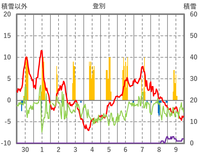 | 日 | 時 | 気温 | 降水 | 風向/風速 | 日照 | 積雪 | 降雪 |