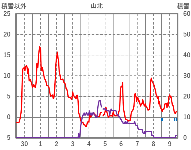 | 日 | 時 | 気温 | 降水 | 風向/風速 | 日照 | 積雪 | 降雪 |