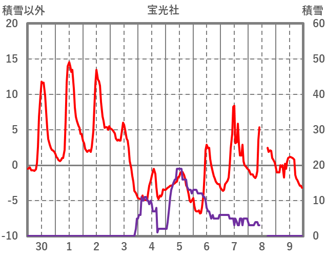 | 日 | 時 | 気温 | 降水 | 風向/風速 | 日照 | 積雪 | 降雪 |