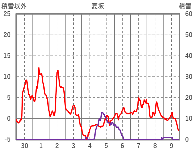 | 日 | 時 | 気温 | 降水 | 風向/風速 | 日照 | 積雪 | 降雪 |