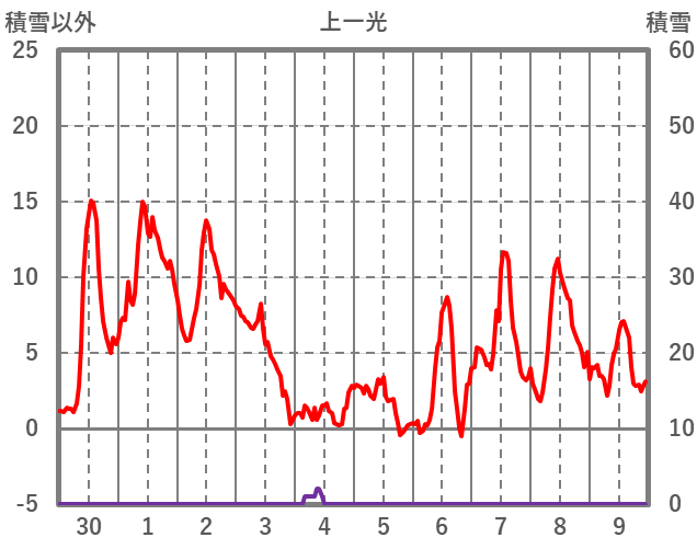 | 日 | 時 | 気温 | 降水 | 風向/風速 | 日照 | 積雪 | 降雪 |