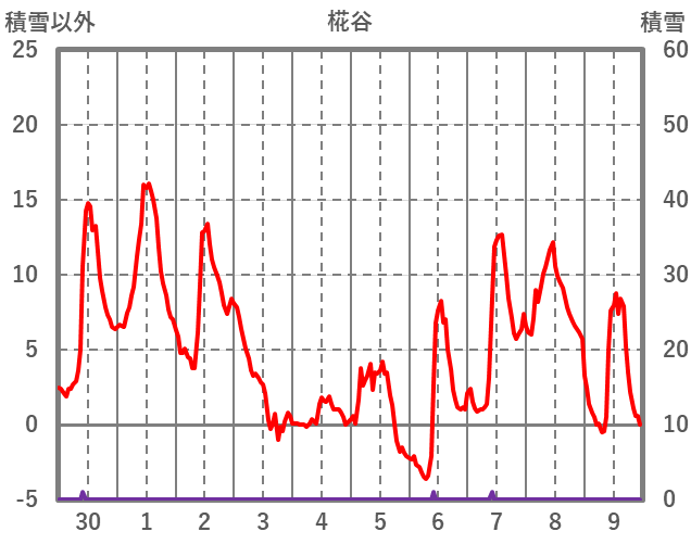 | 日 | 時 | 気温 | 降水 | 風向/風速 | 日照 | 積雪 | 降雪 |