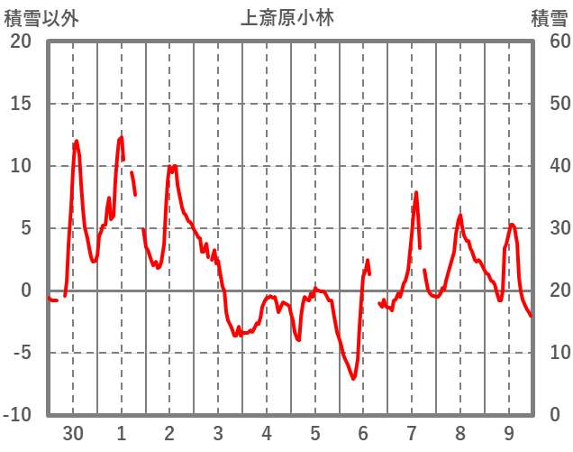 | 日 | 時 | 気温 | 降水 | 風向/風速 | 日照 | 積雪 | 降雪 |